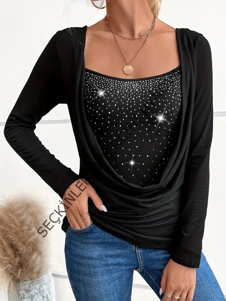 Kadın Uzun Kollu Derin Degaje Yakalı Taşlı Sandy Bluz