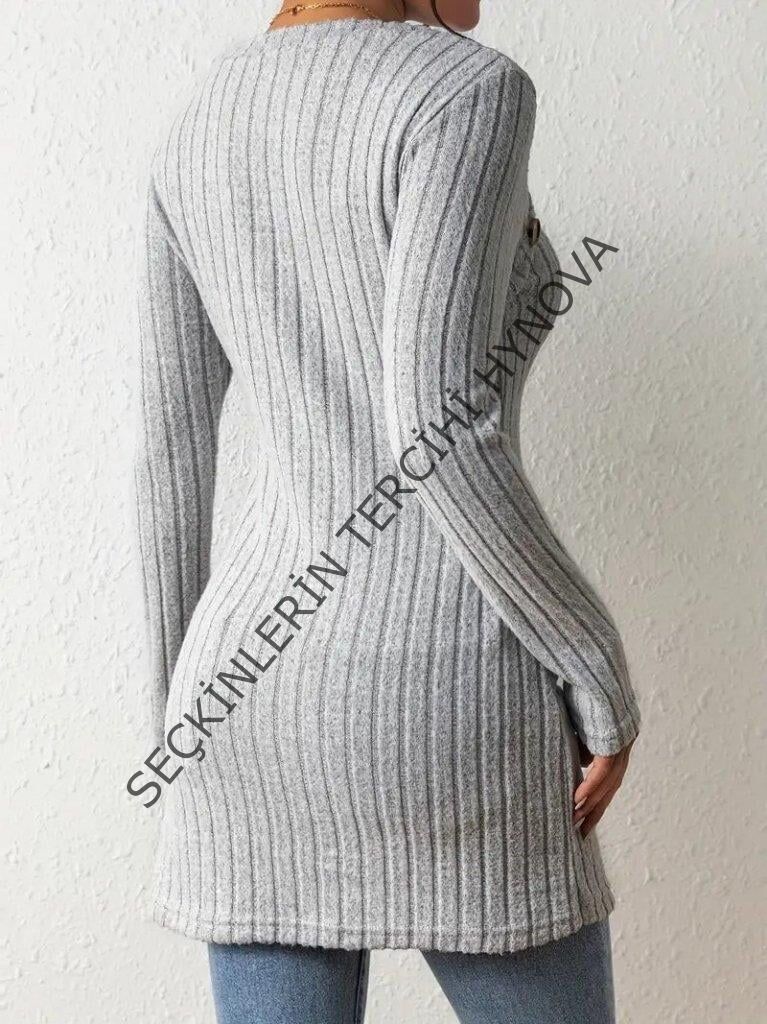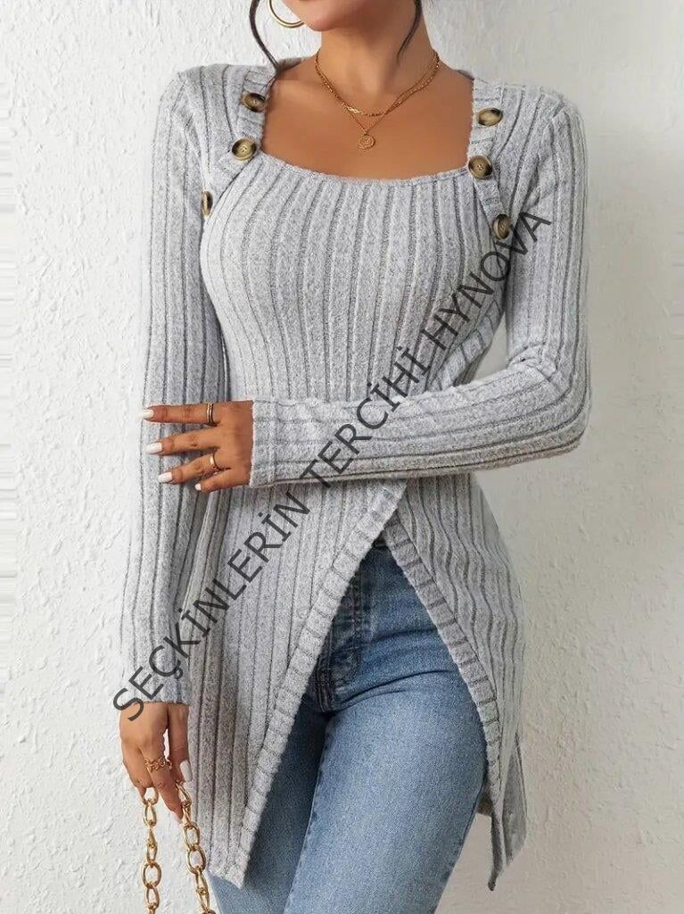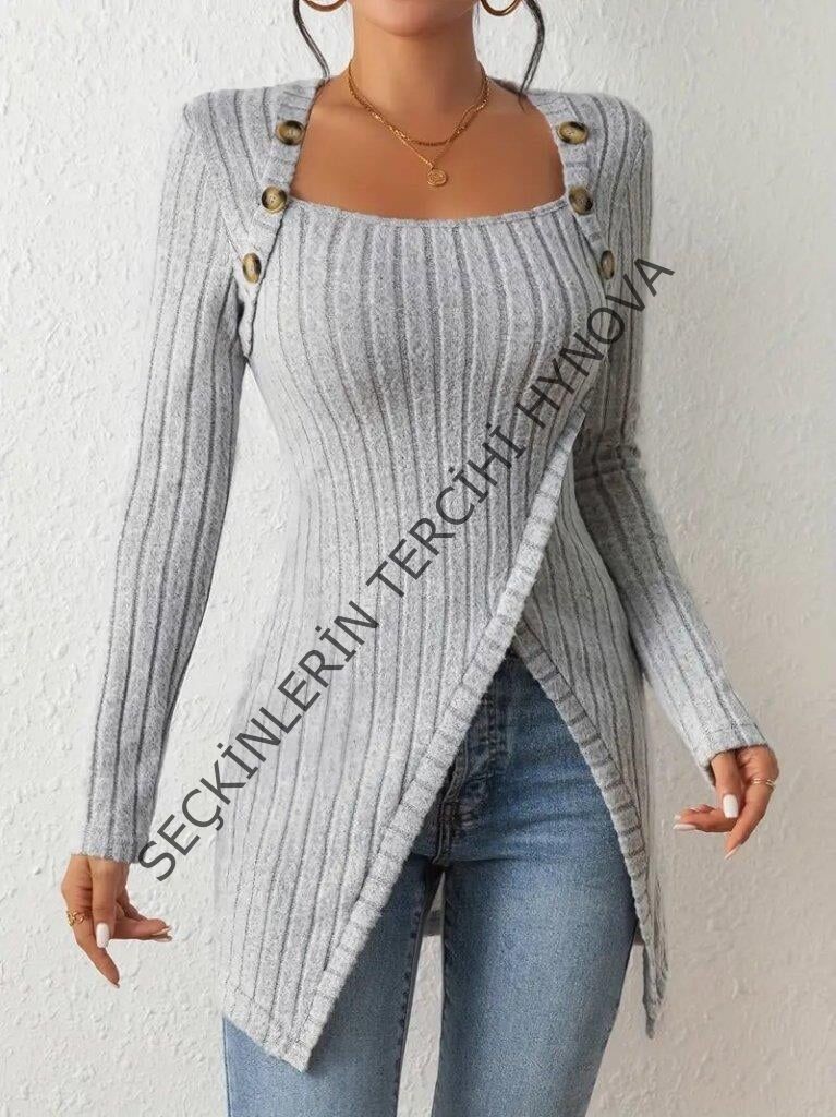 Kadın Uzun Kollu Derin Kare Yaka Düğme Detay şardonlu Kaşkorse Kruvaze Bluz