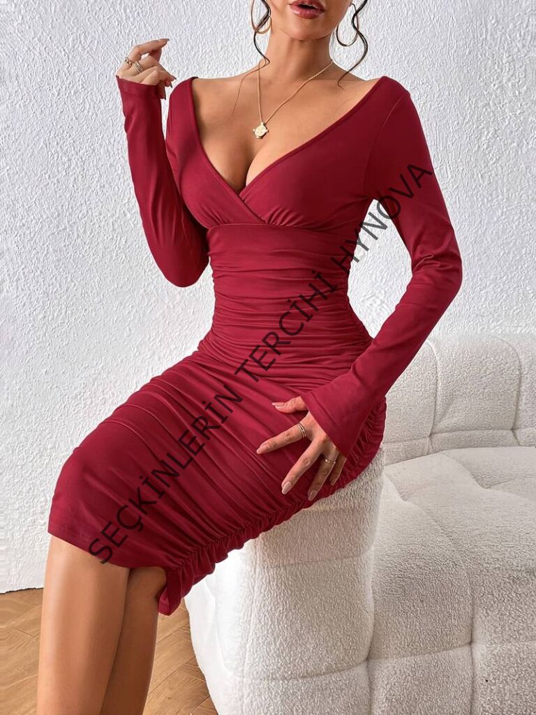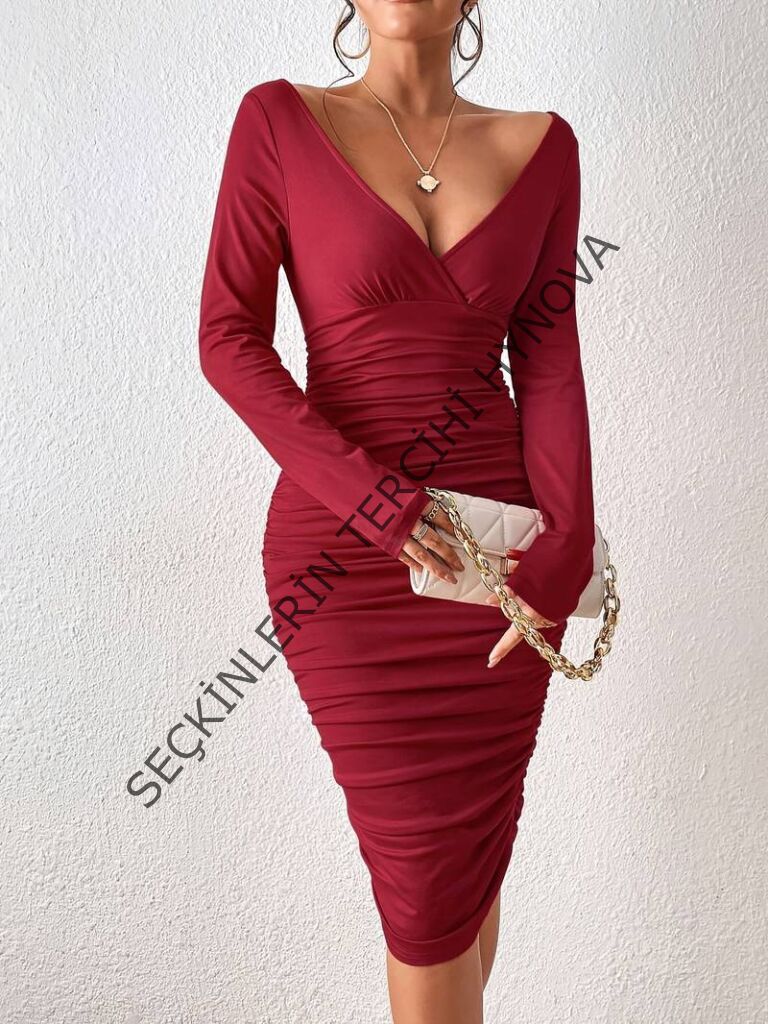 Kadın Uzun Kollu Derin Kruvaze Yakalı Büzgülü Sandy Midi Elbise