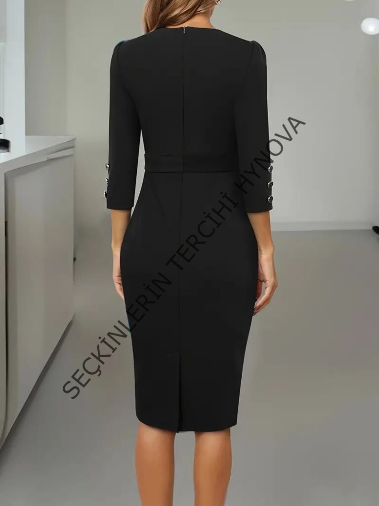 Kadın Uzun Kollu Düğme Detaylı Kendinden Kemerli Ithal Krep Elbise