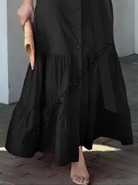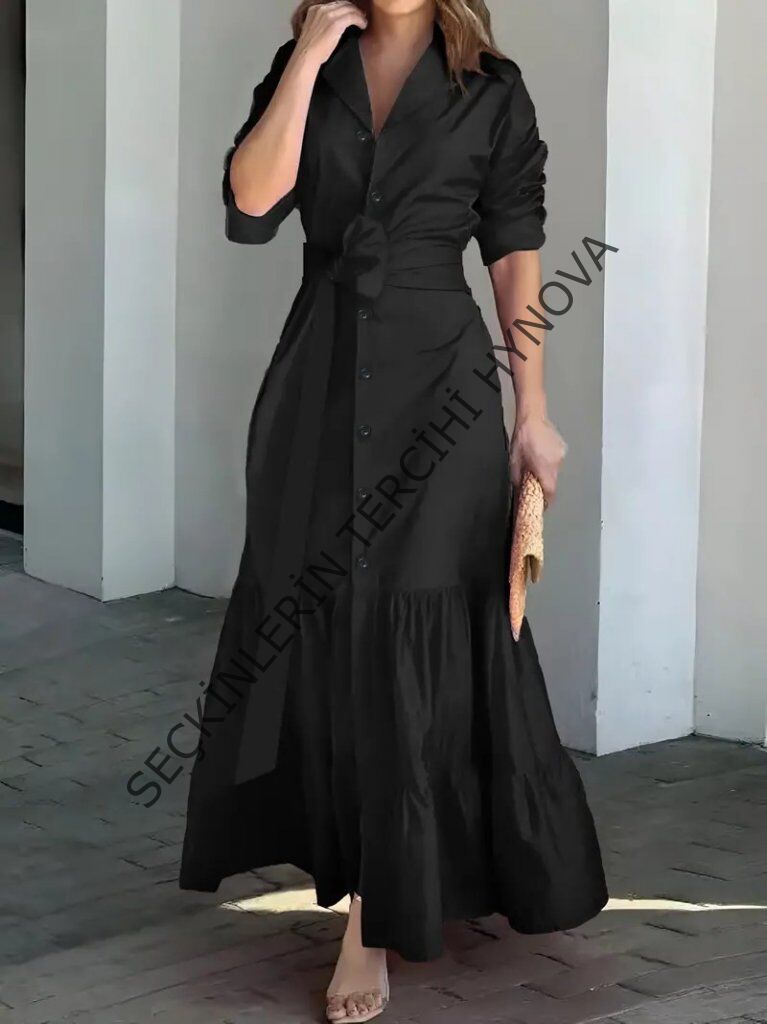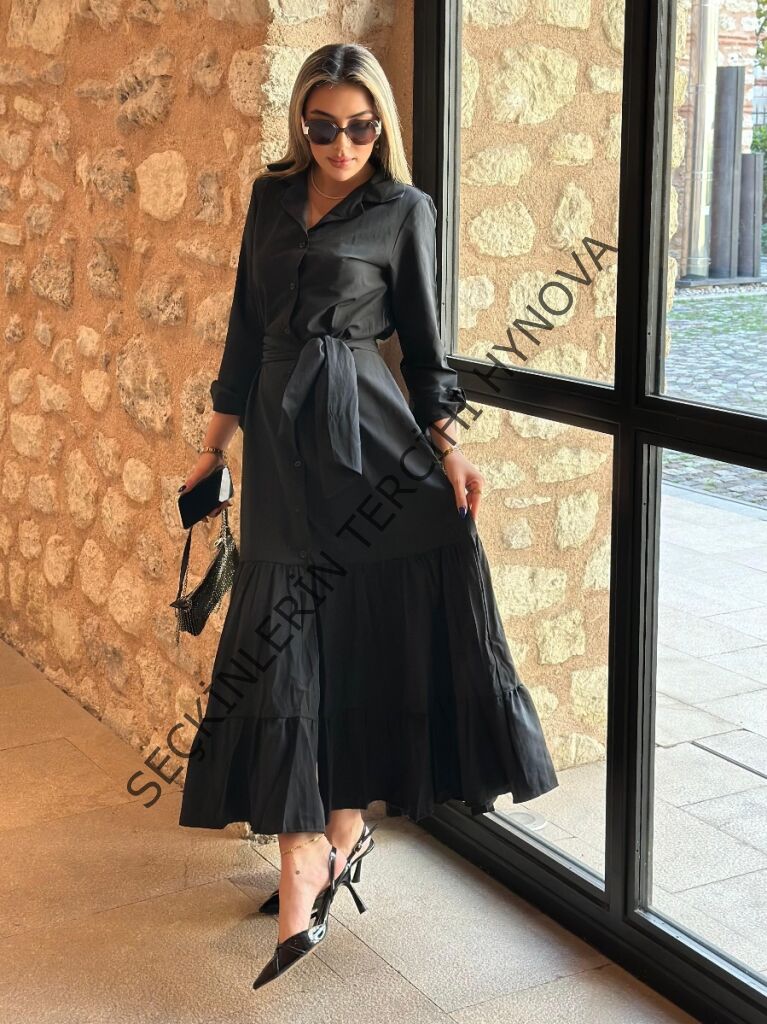 Kadın Uzun Kollu Eteği Fırfırlı Beli Kuşaklı Trikoton Tam Boy Gömlek Elbise