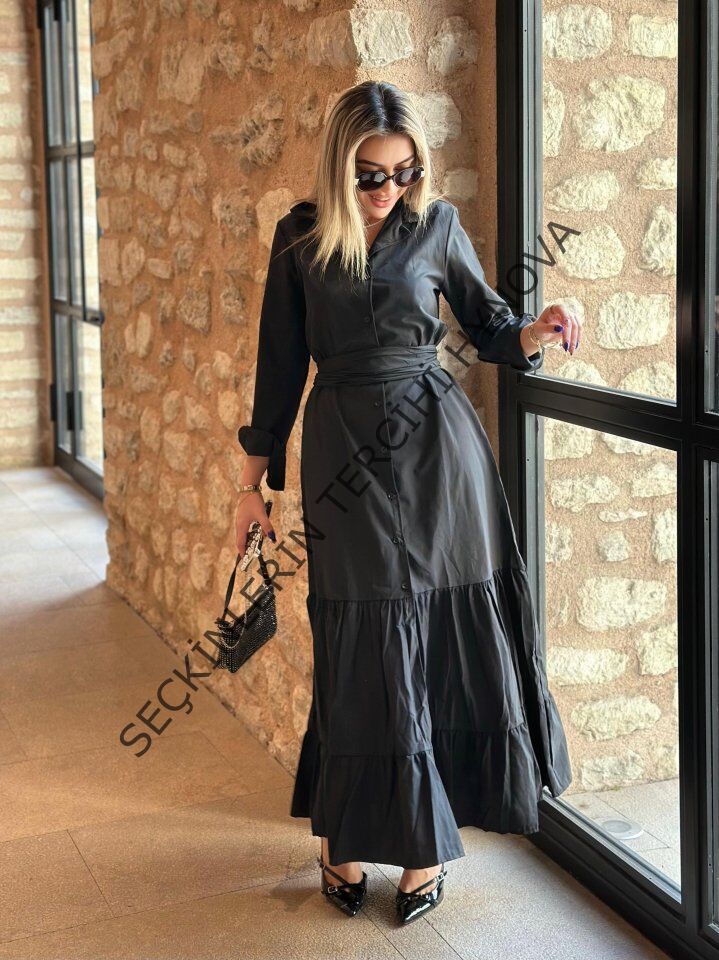 Kadın Uzun Kollu Eteği Fırfırlı Beli Kuşaklı Trikoton Tam Boy Gömlek Elbise