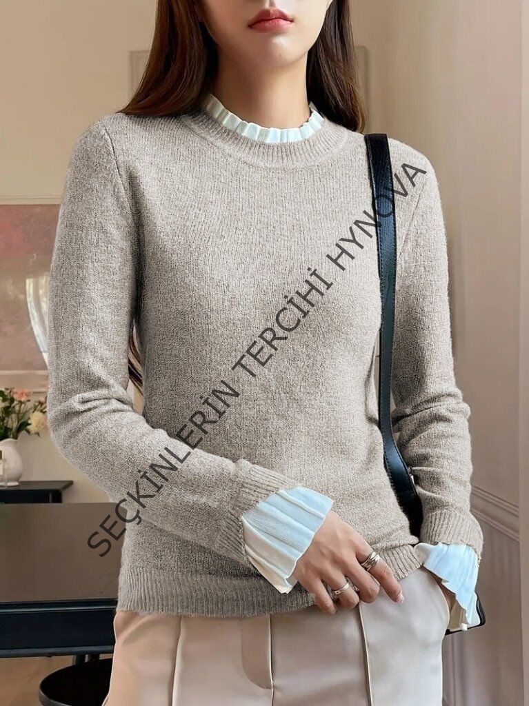 Kadın Uzun Kollu Fırfırlı Yakalı Triko Krem Bluz