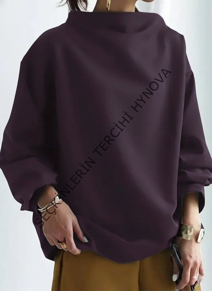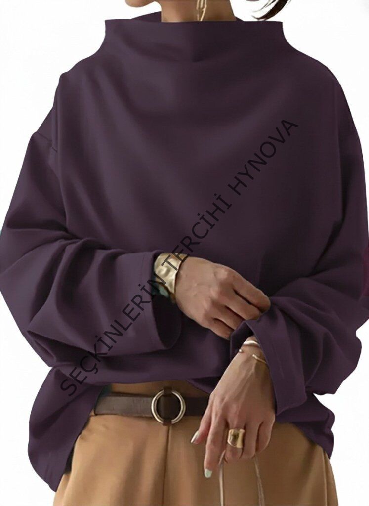 Kadın Uzun Kollu Geniş Balıkçı Yaka Modal Mürdüm Bluz