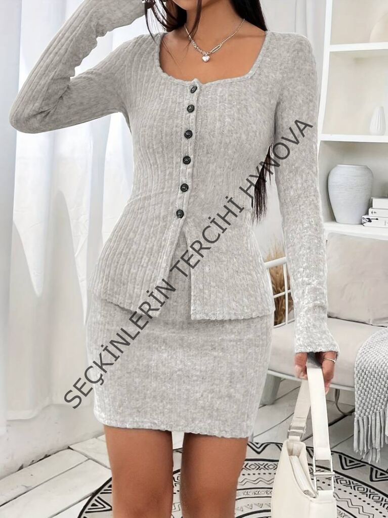 Kadın Uzun Kollu Geometrik Yaka önden Düğmeli şardonlu Kaşkorse Bluz Ve Etek Ikili Takım