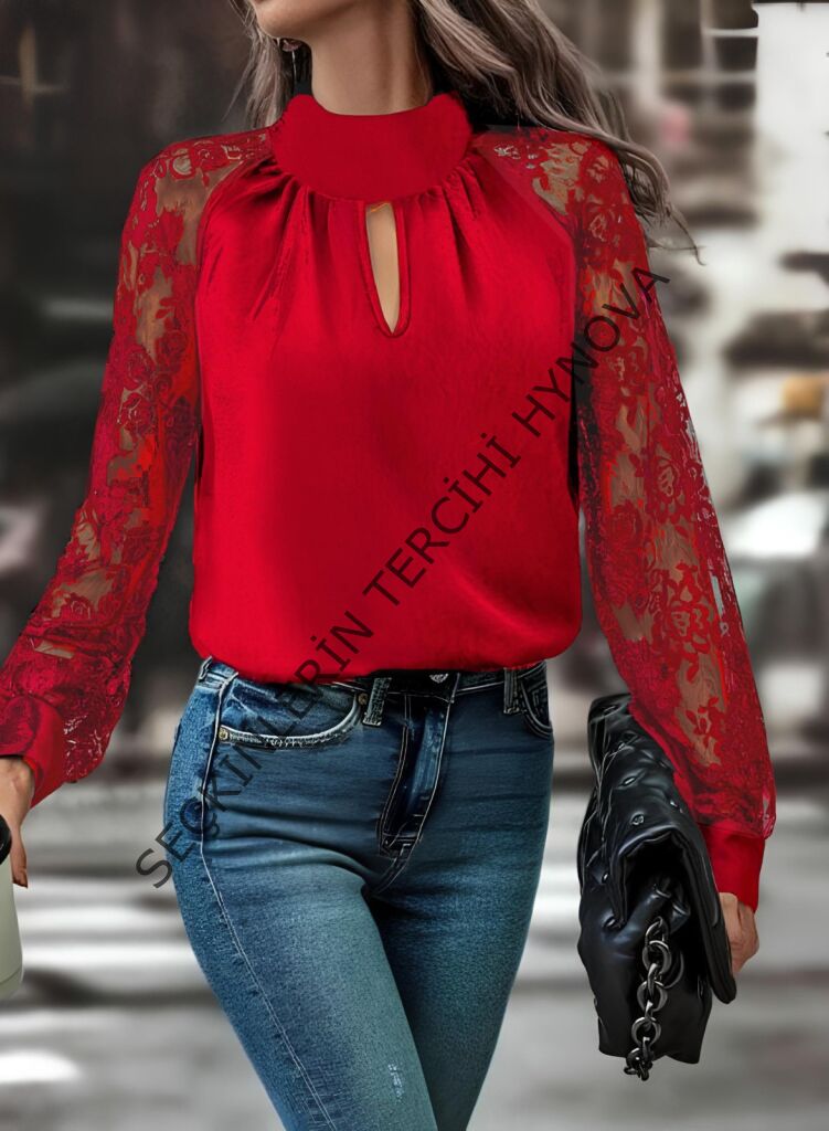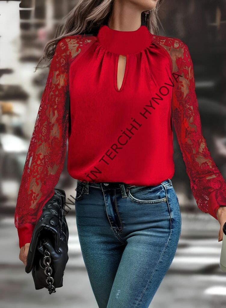 Kadın Uzun Kollu Göğüs Pencere Detay Yaka Boğazlı Kolları Tüllü Sandy Bluz