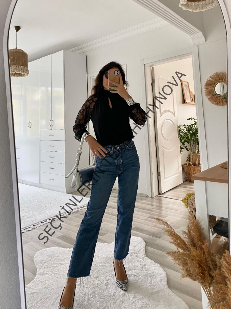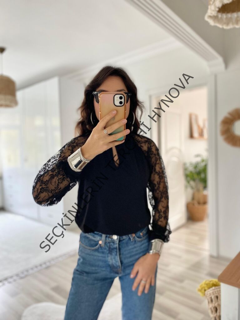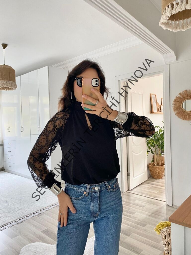Kadın Uzun Kollu Göğüs Pencere Detay Yaka Boğazlı Kolları Tüllü Sandy Bluz