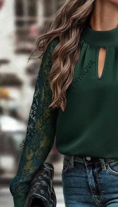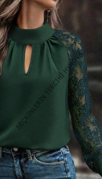 Kadın Uzun Kollu Göğüs Pencere Detay Yaka Boğazlı Kolları Tüllü Sandy Bluz