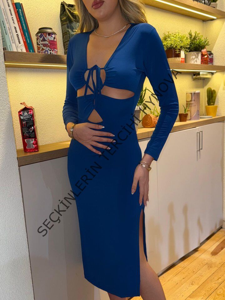 Kadın Uzun Kollu Göğüs Ve Göbek Dekolte Detay Sandy Midi Boy Elbise