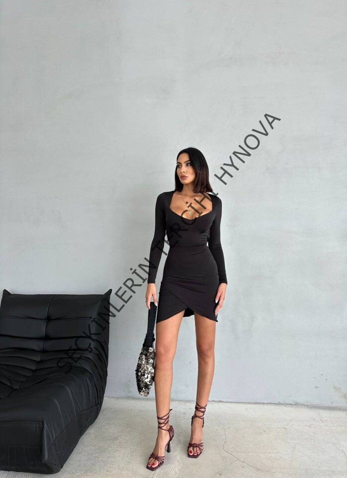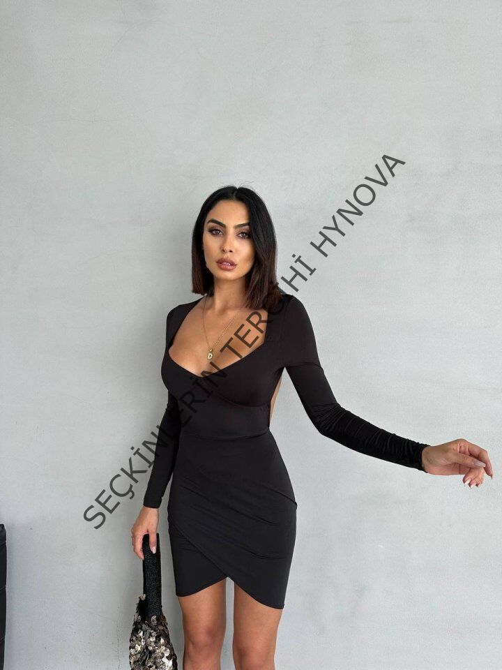 Kadın Uzun Kollu Göğüs Ve Sırt Dekolteli Kruvaze Etek Detay Fırsat ürün Mini Elbise
