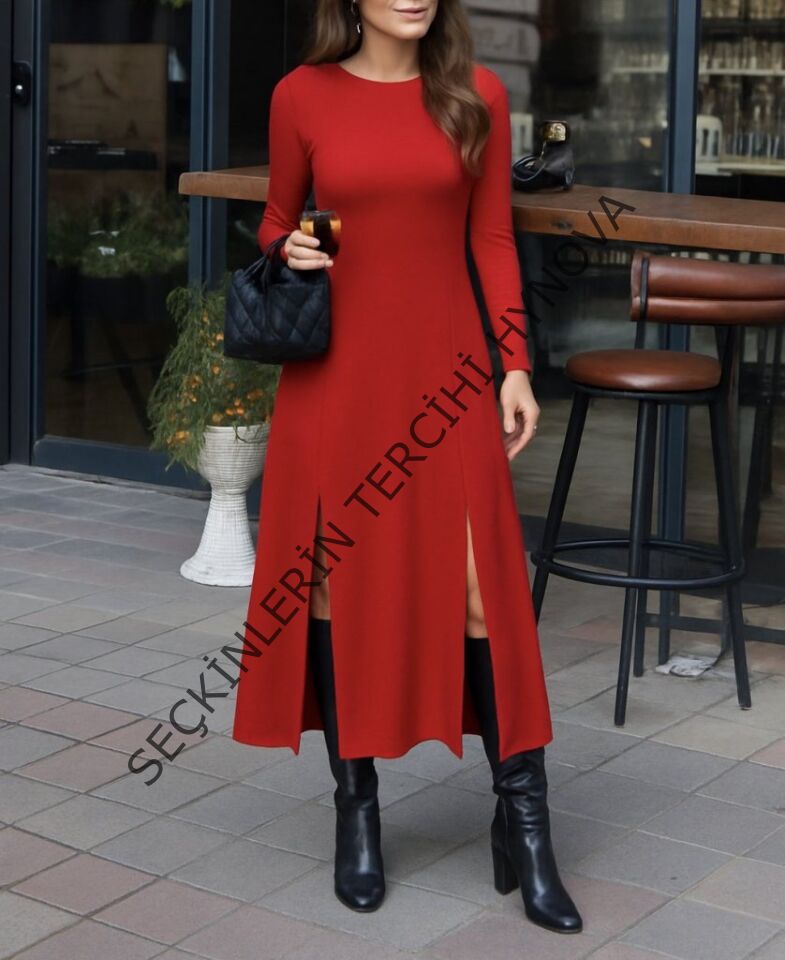 Kadın Uzun Kollu Hafif Kayık Yaka Sırt Dekolteli Yırtmaç Detaylı Viskon Tam Boy Elbise