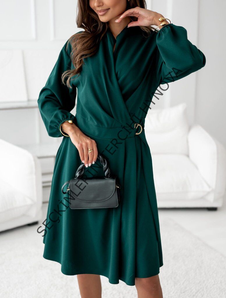 Kadın Uzun Kollu Hakim V Yakalı Yandan Toka Detaylı Ithal Mini Krep Elbise