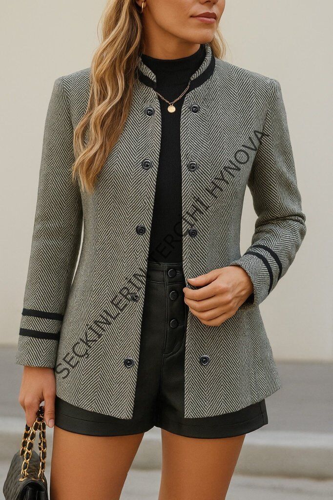 Kadın Uzun Kollu Hakim Yaka Düğme Detaylı Mini Dokuma Ceket