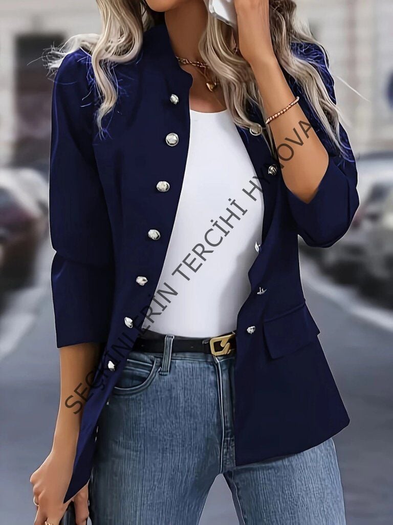 Kadın Uzun Kollu Hakim Yaka önden Düğmeli Kısa Atlas Ceket