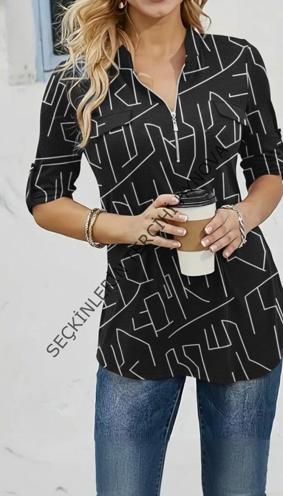 Kadın Uzun Kollu Hakim Yaka Yakadan Fermuarlı Geometrik Desenli Süprem Bluz