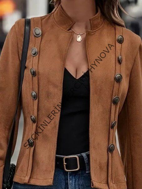 Kadın Uzun Kollu Hakim Yaka Yanlardan Düğmeli Kısa Süet Ceket