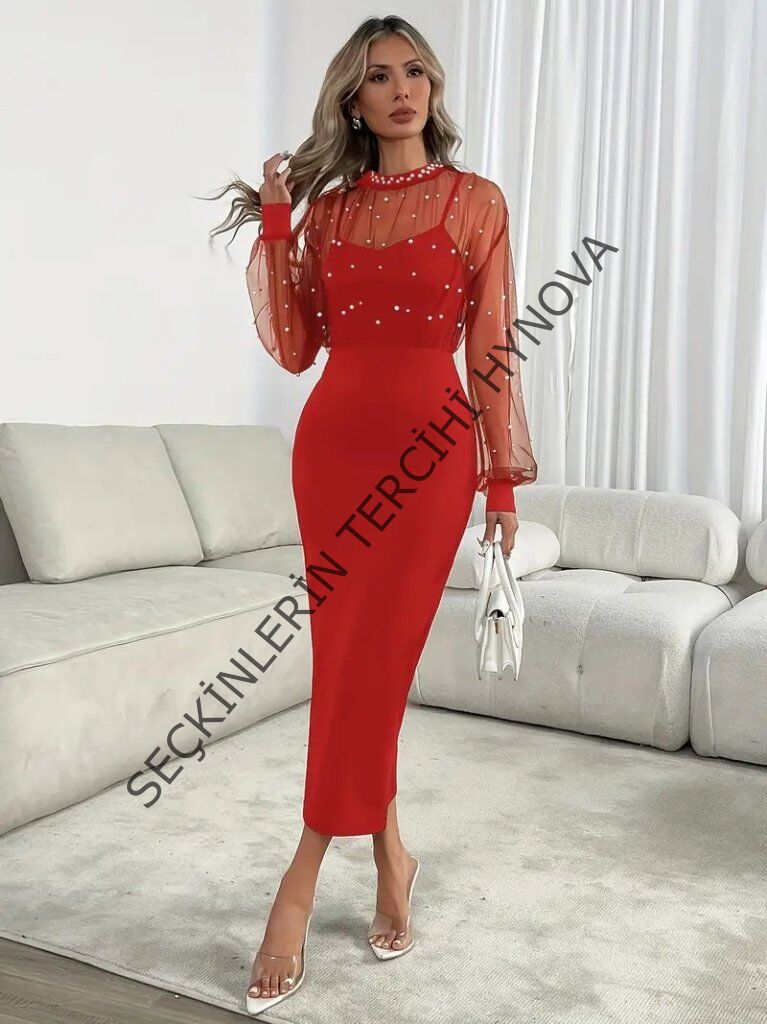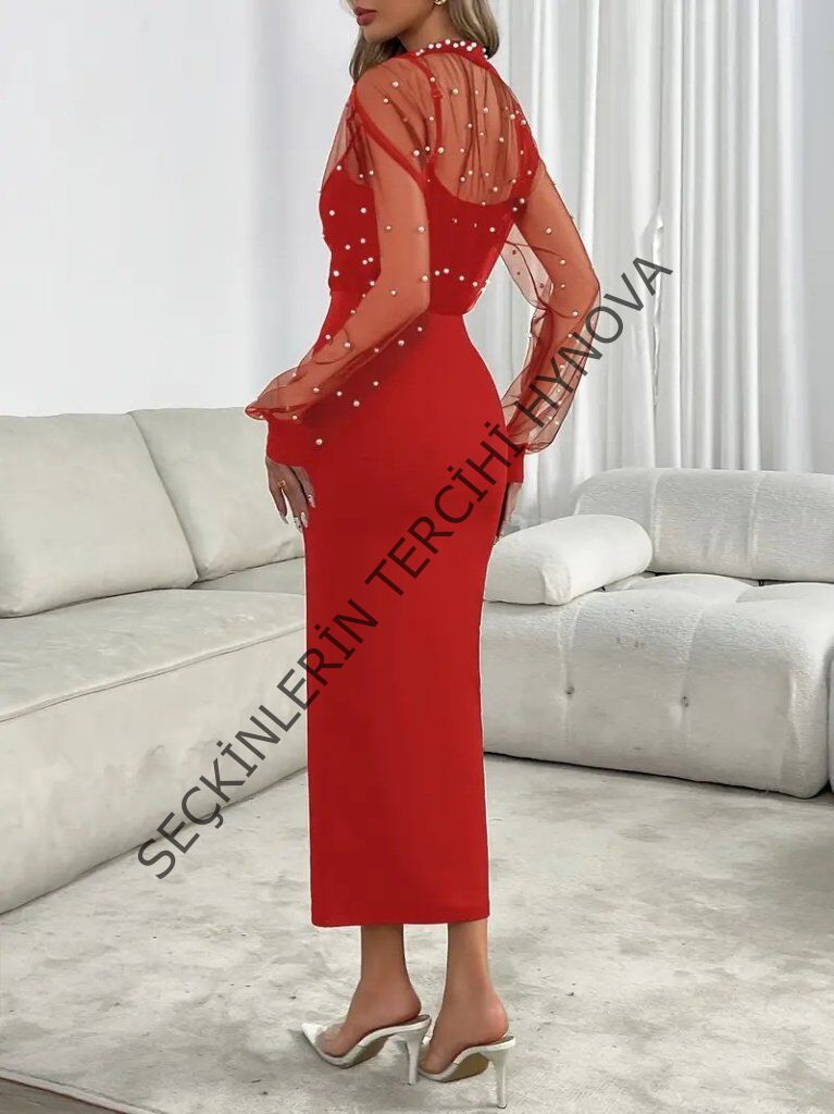 Kadın Uzun Kollu Halka Yaka Tül Inci Detaylı Uzun Ithal Krep Elbise
