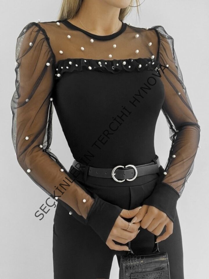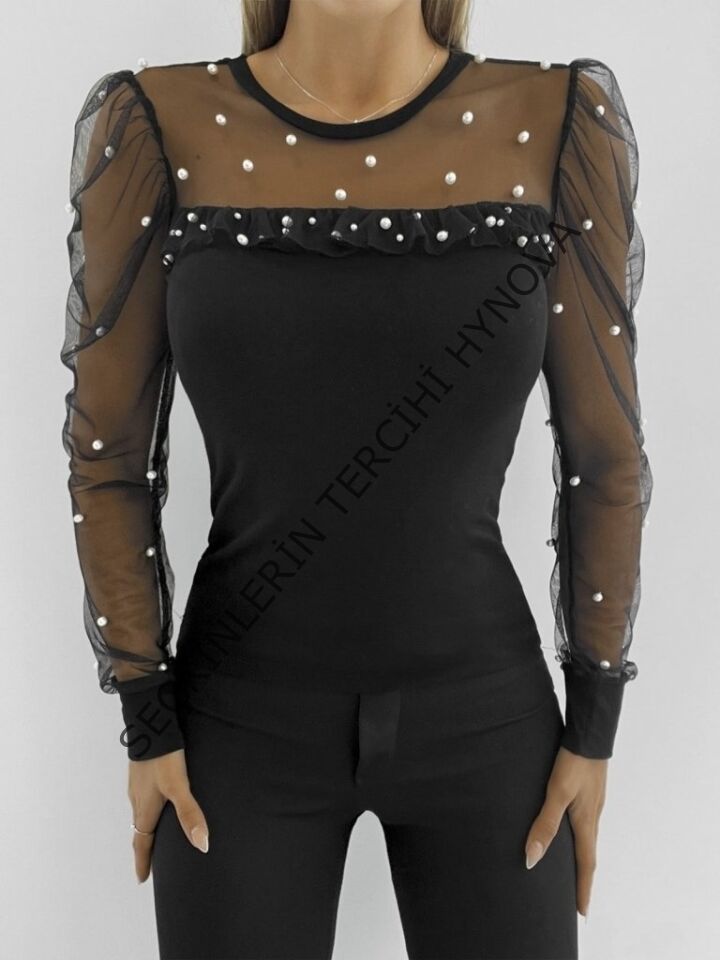 Kadın Uzun Kollu Inci Detaylı Tüllü Viskon Bluz