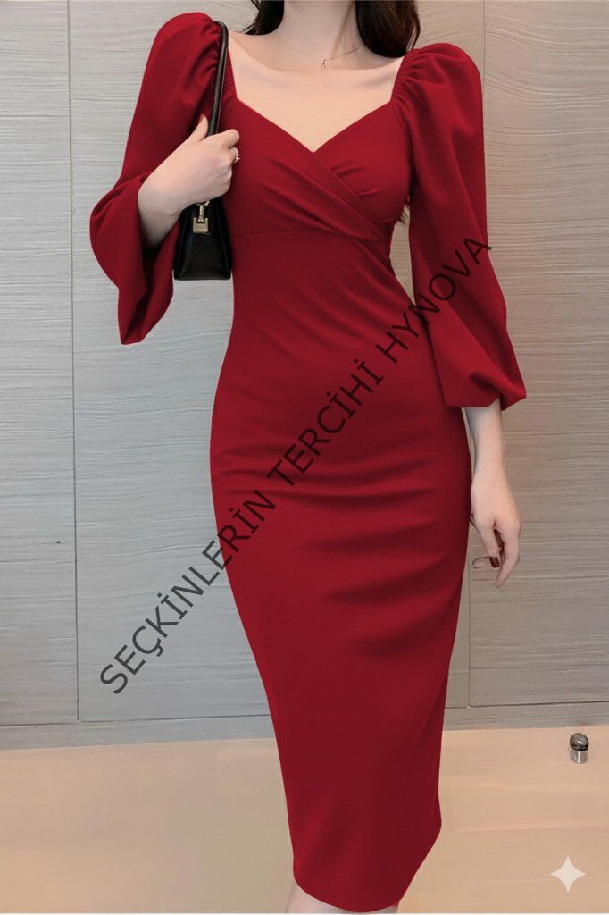 Kadın Uzun Kollu Kalp Yakalı Midi Ithal Krep Elbise