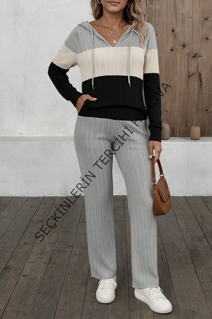 Kadın Uzun Kollu Kapşonlu Bağcıklı Blok Renkli şardonlu Kaşkorse Bluz Ve Pantolon Ikili Takım