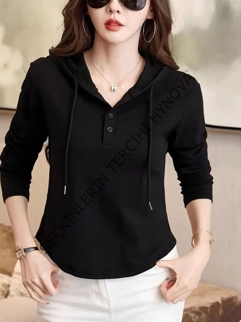 Kadın Uzun Kollu Kapşonlu Bağcıklı Düğmeli Viskon Iki Iplik Bluz