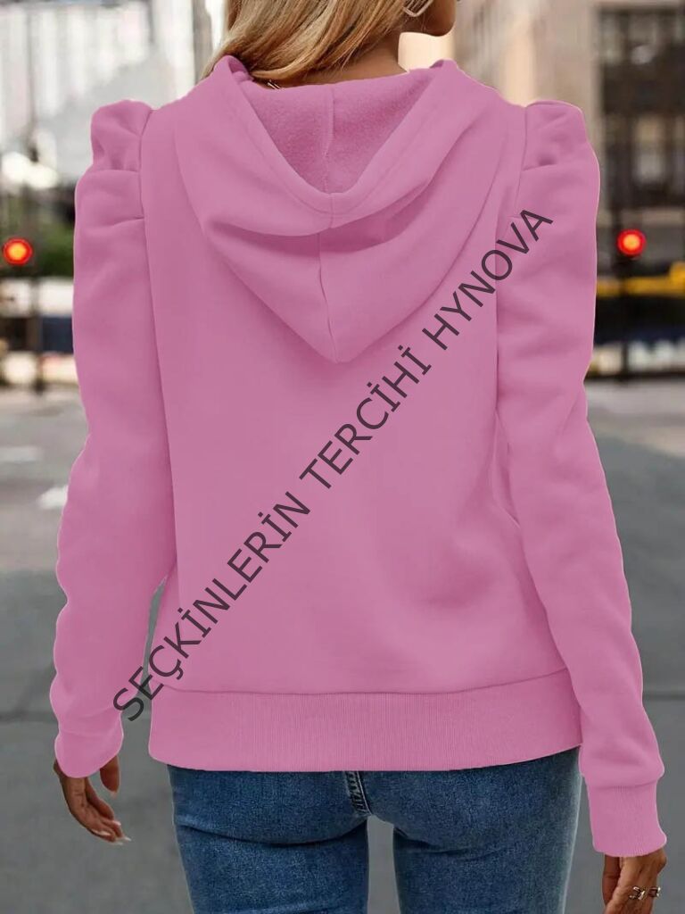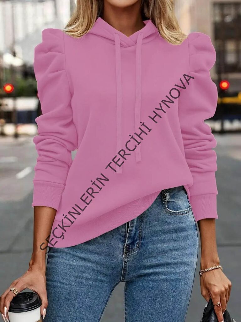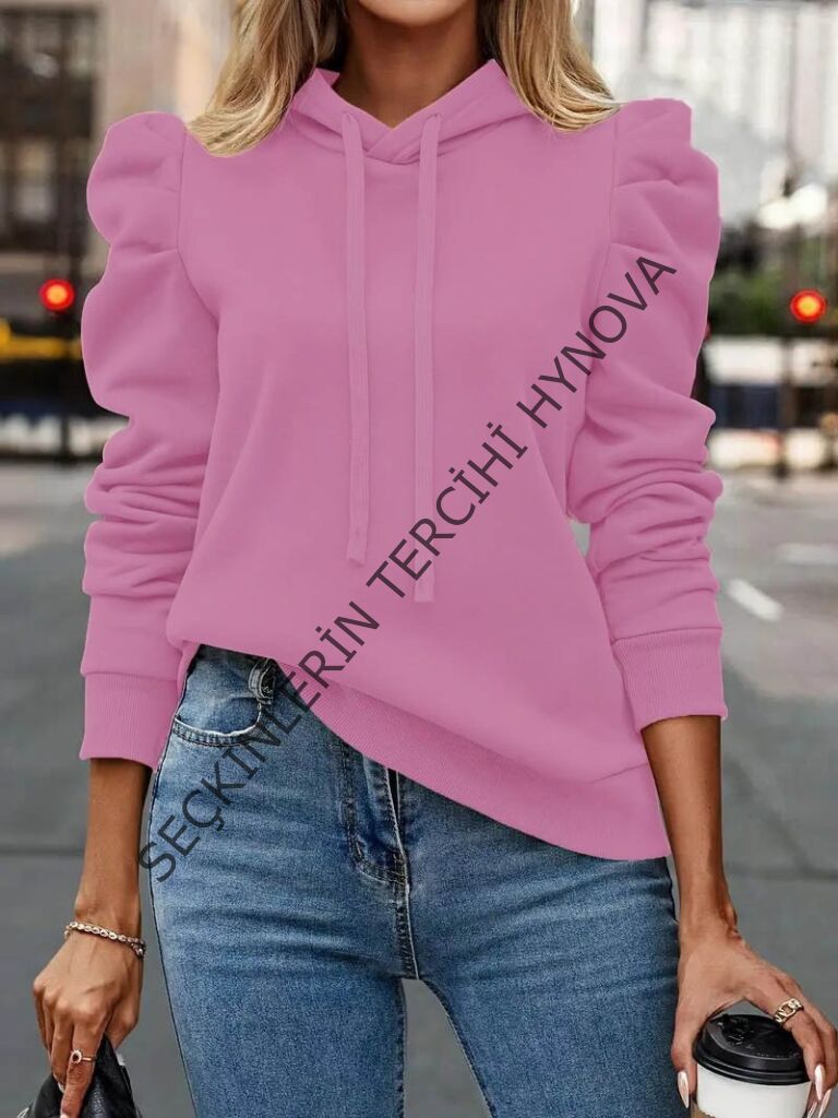 Kadın Uzun Kollu Kapşonlu Bağcıklı Kollarda Büzgü Detaylı Iki Iplik Bluz