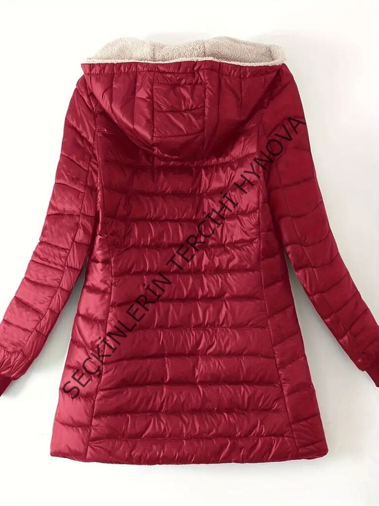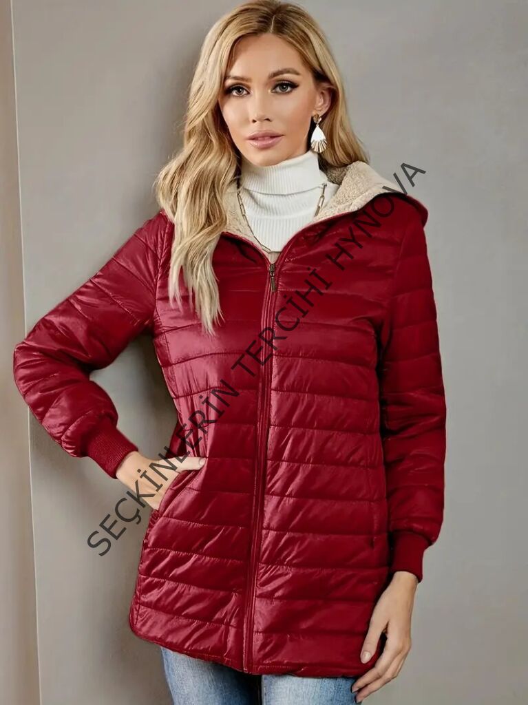 Kadın Uzun Kollu Kapşonlu Cep Detaylı Fermuarlı Orta Boy Mont