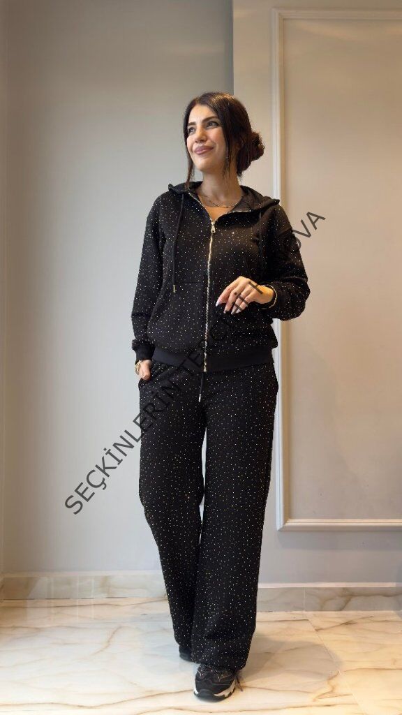 Kadın Uzun Kollu Kapşonlu Fermuarlı Taşlı önü Fermuarlı Viskon Iki Iplik Bluz Ve Eşofman Altı Ikili Takım