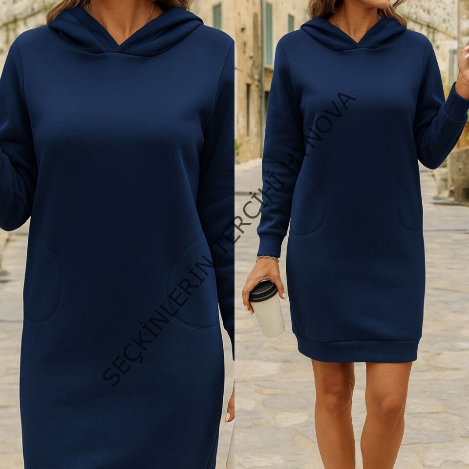Kadın Uzun Kollu Kapşonlu Kısa Iki Iplik Elbise