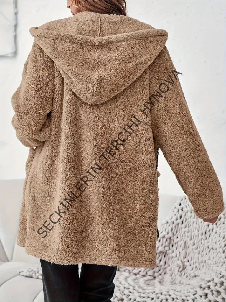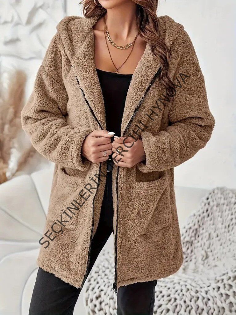 Kadın Uzun Kollu Kapşonlu önden Fermuarlı Cepli Welsoft Ceket