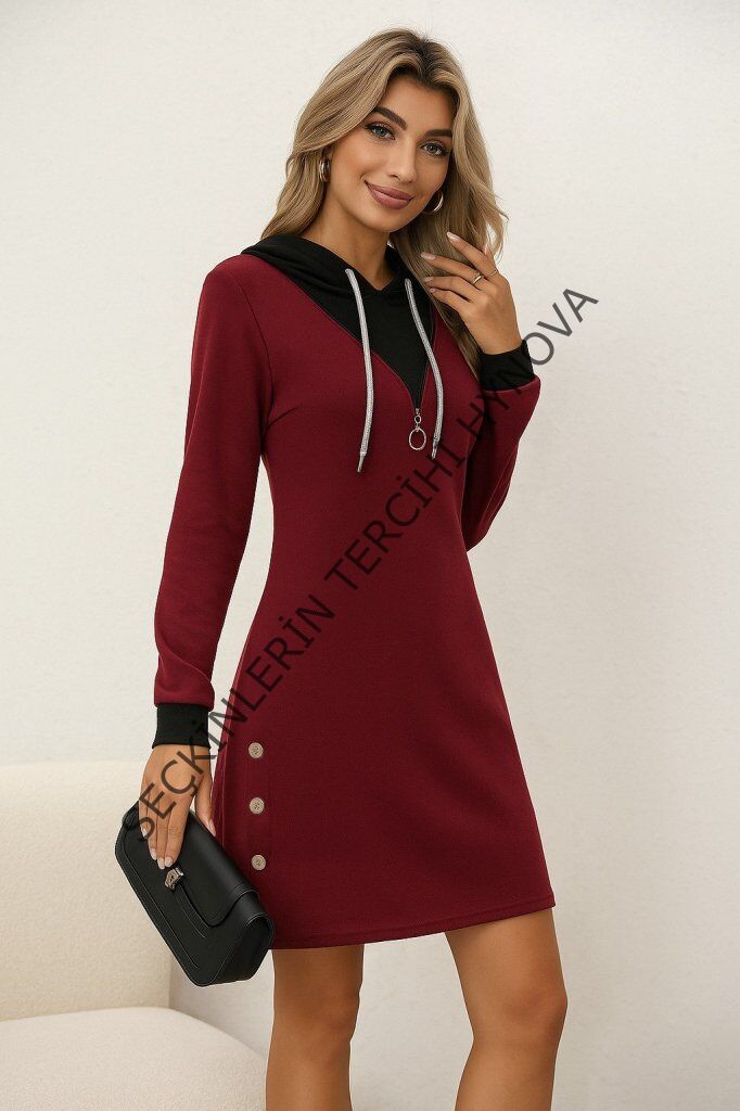 Kadın Uzun Kollu Kapşonlu önden Fermuarlı Düğmeli Mini Iki Iplik Elbise