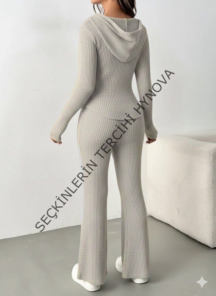 Kadın Uzun Kollu Kapşonlu önden Fermuarlı Kaşkorse Bluz Ve Pantolon Ikili Takım