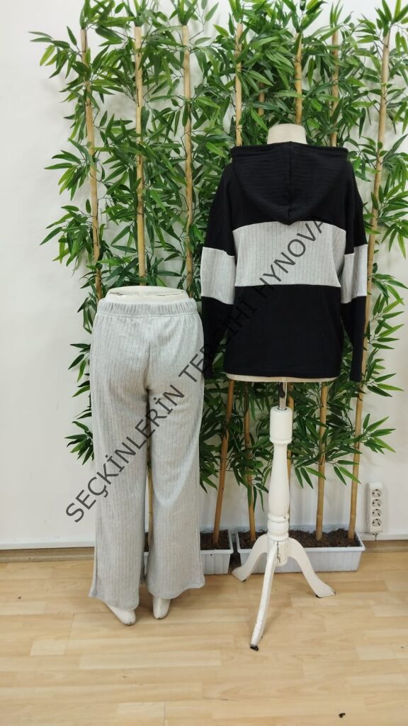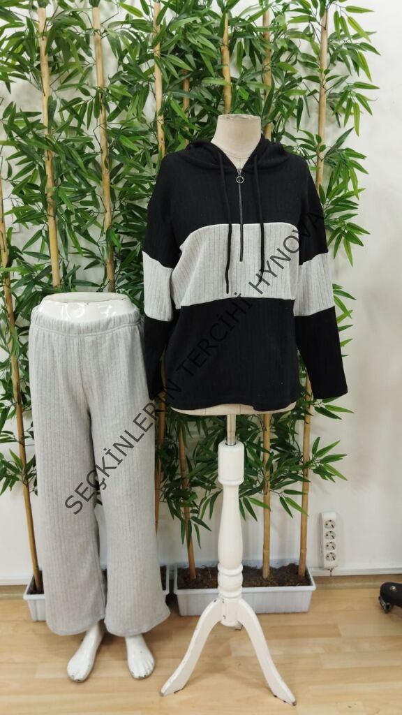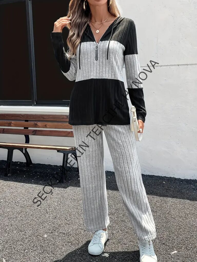 Kadın Uzun Kollu Kapşonlu önden Fermuarlı şardonlu Kaşkorse Bluz Ve Pantolon