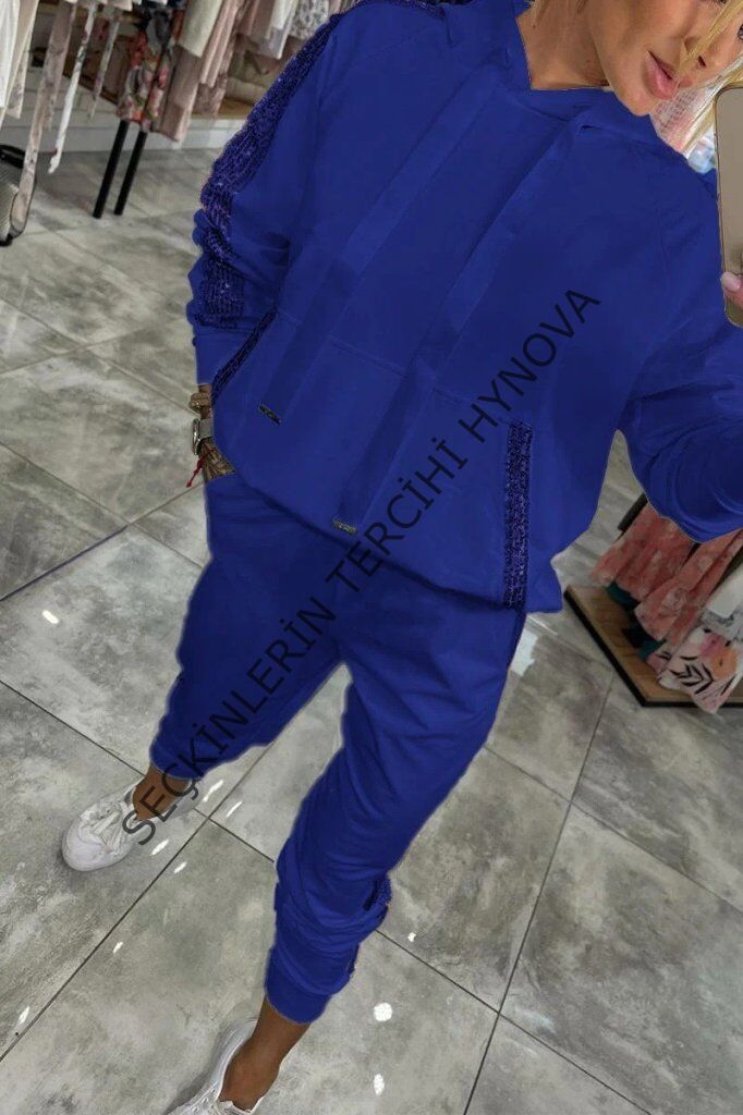Kadın Uzun Kollu Kapşonlu Pulpayet Detay Viskon Iki Iplik Bluz Ve Pantolon Ikili Takım