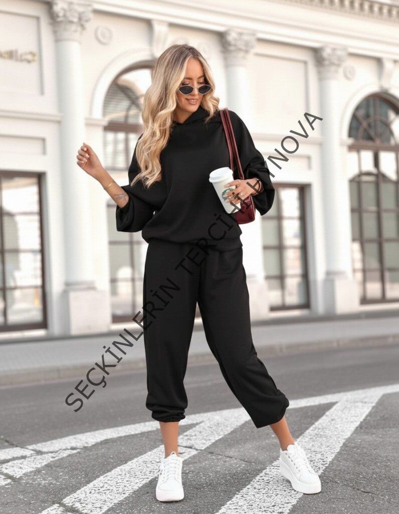 Kadın Uzun Kollu Kapşonlu Viskon Iki Iplik Bluz Ve Pantolon Ikili Takım