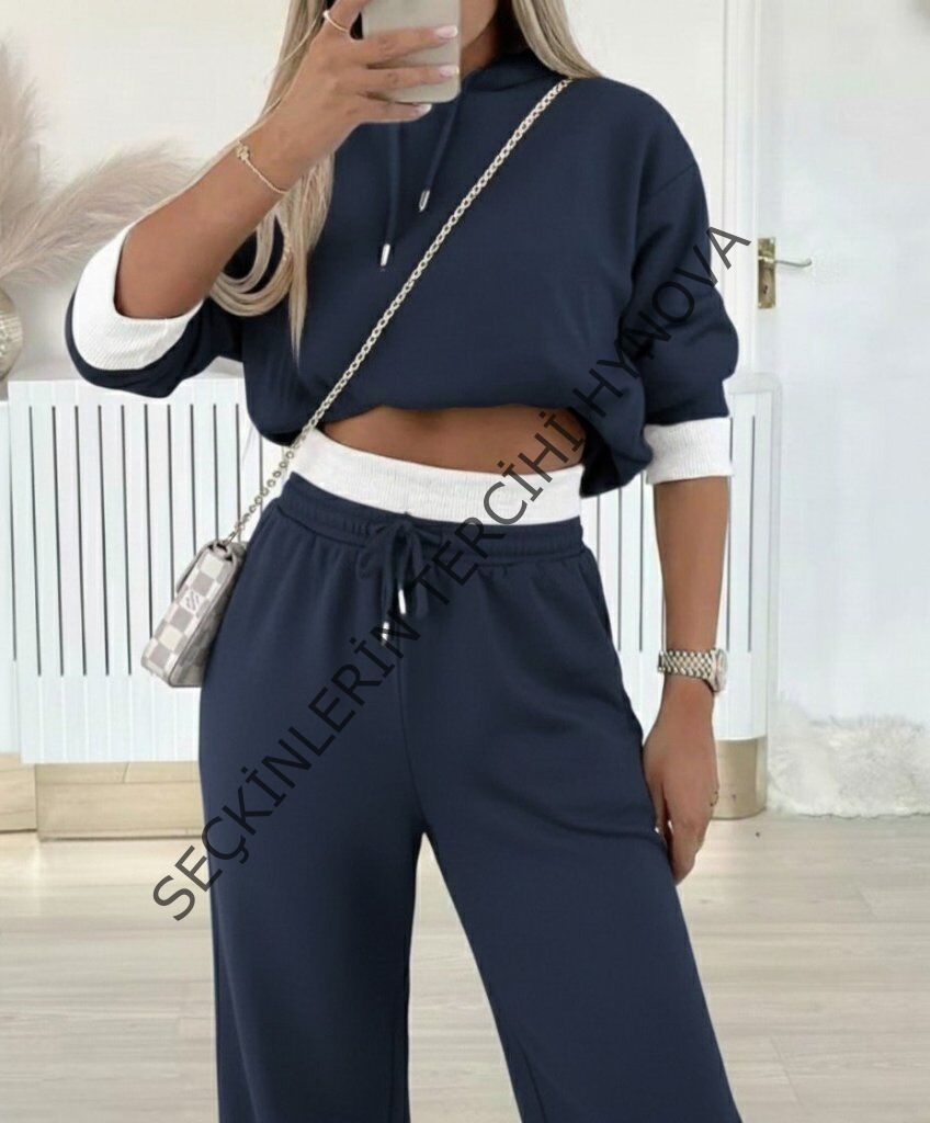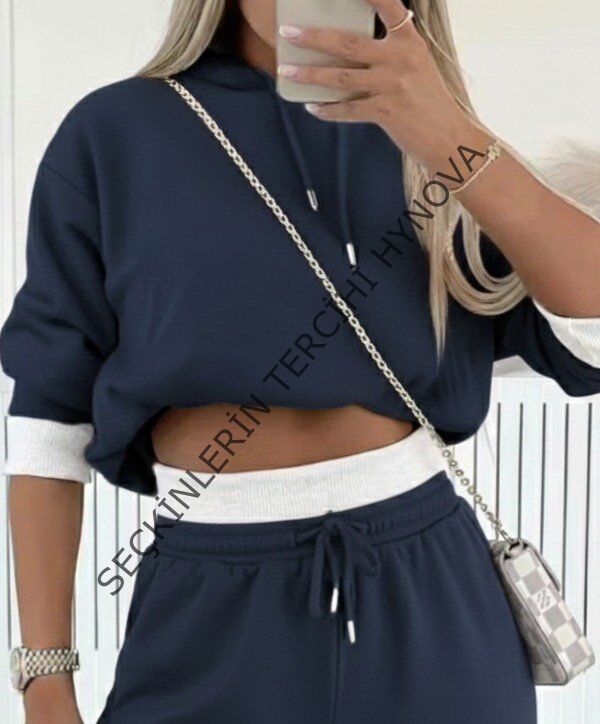 Kadın Uzun Kollu Kapşonlu Viskon Iki Iplik Füme Bluz Ve Pantolon Ikili Takım