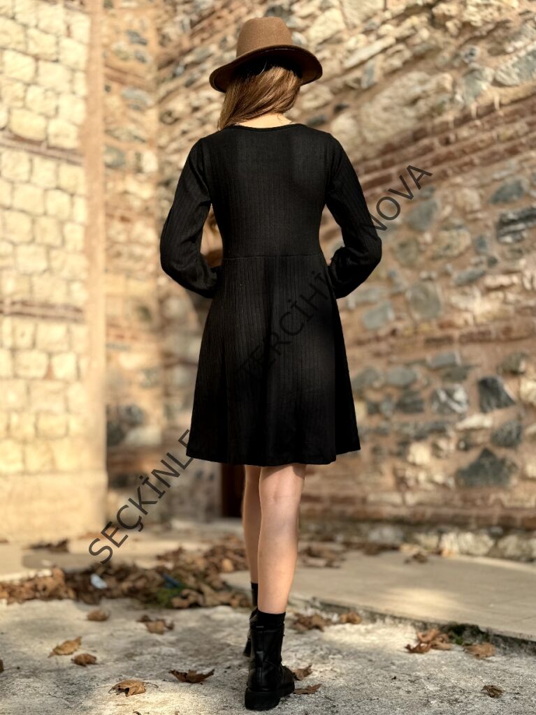 Kadın Uzun Kollu Kare Yaka Düğmeli Kısa şardonlu Iki Iplik Mini Elbise