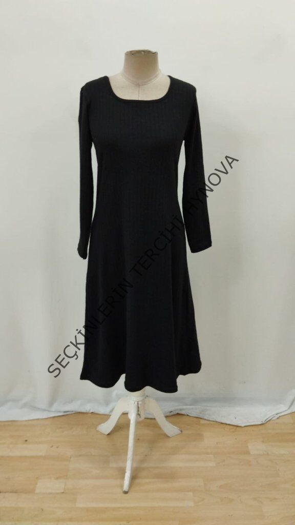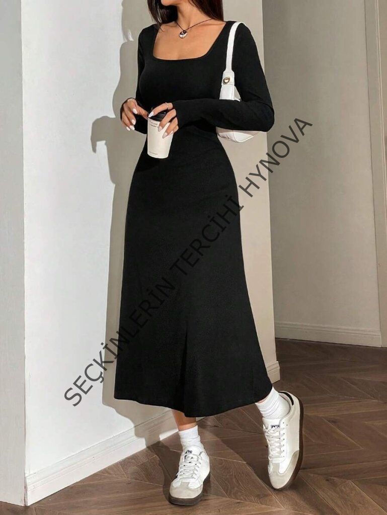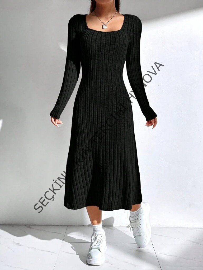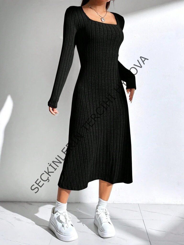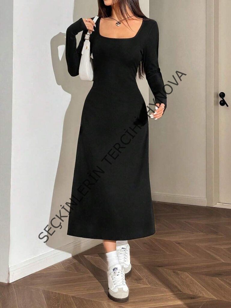 Kadın Uzun Kollu Kare Yaka Midi Kaşkorse Elbise