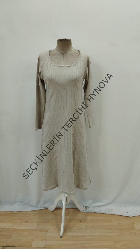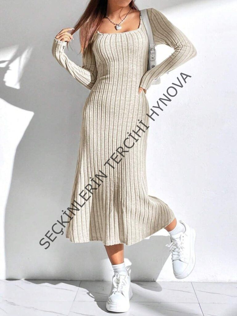 Kadın Uzun Kollu Kare Yaka Midi Kaşkorse Elbise