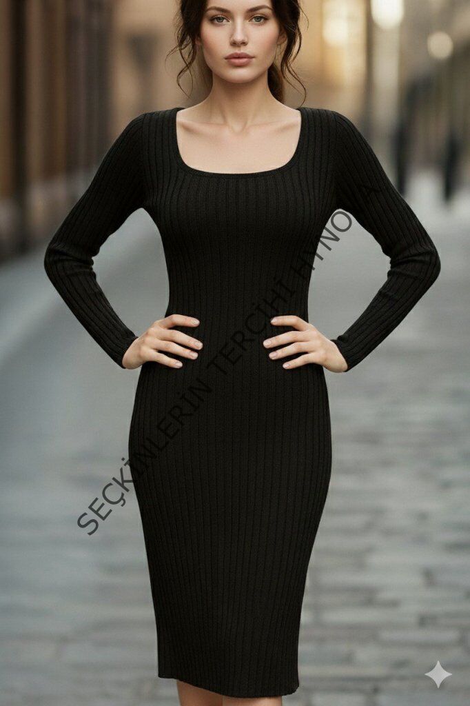 Kadın Uzun Kollu Kare Yakalı Midi şardonlu Kaşkorse Elbise