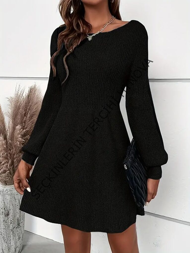Kadın Uzun Kollu Kayık Yaka Kısa Triko Elbise
