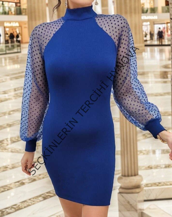 Kadın Uzun Kollu Kollar Tül Puantiye Detay Dalgıç Mini Boy Elbise