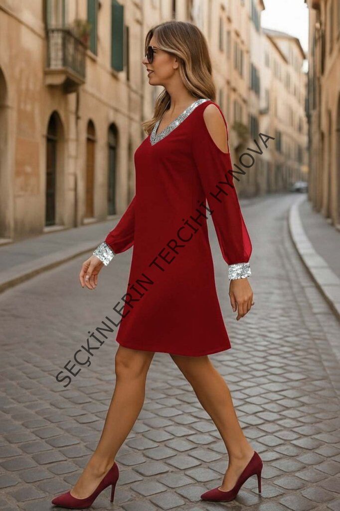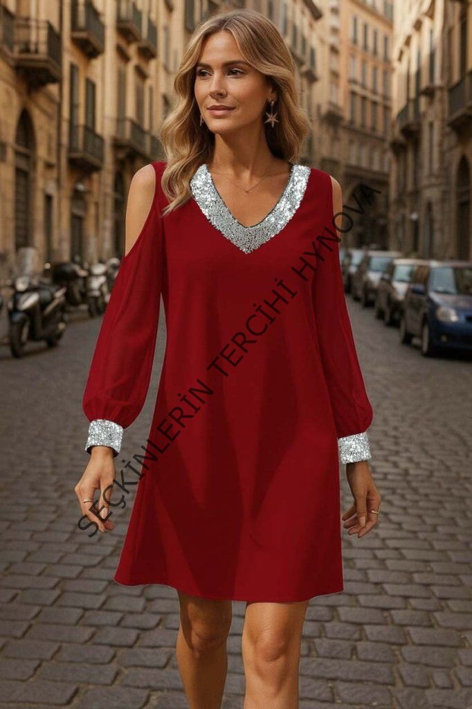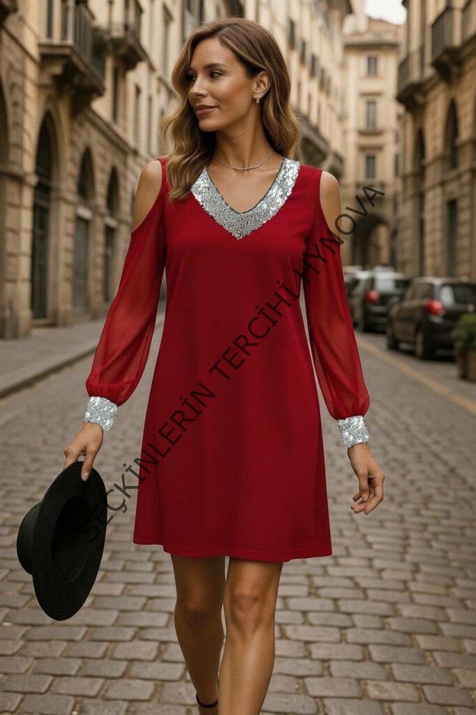 Kadın Uzun Kollu Kollar Tül V Yakalı Mini Janjan Krep Elbise