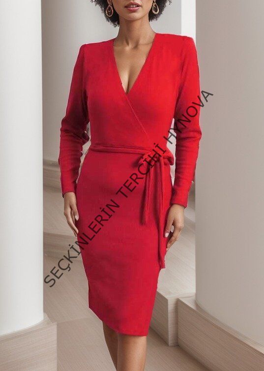 Kadın Uzun Kollu Kruvaze Yaka Bağcık Detay Akrilik Mini Boy Elbise