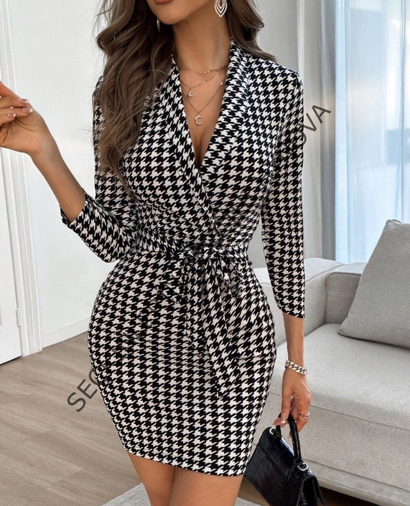 Kadın Uzun Kollu Kruvaze Yaka Bağlamalı Kemer Dalgıç Mini Boy Elbise
