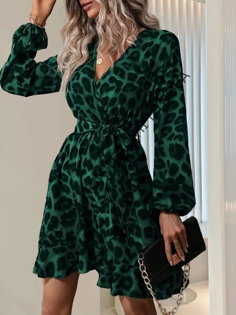 Kadın Uzun Kollu Kruvaze Yaka Beden Kuşaklı çapraz Kesim Detaylı Leopar Modal Mini Elbise