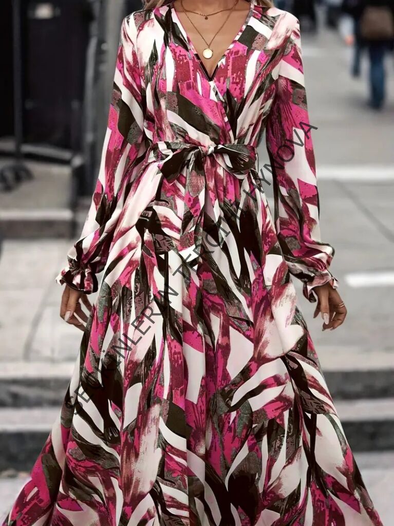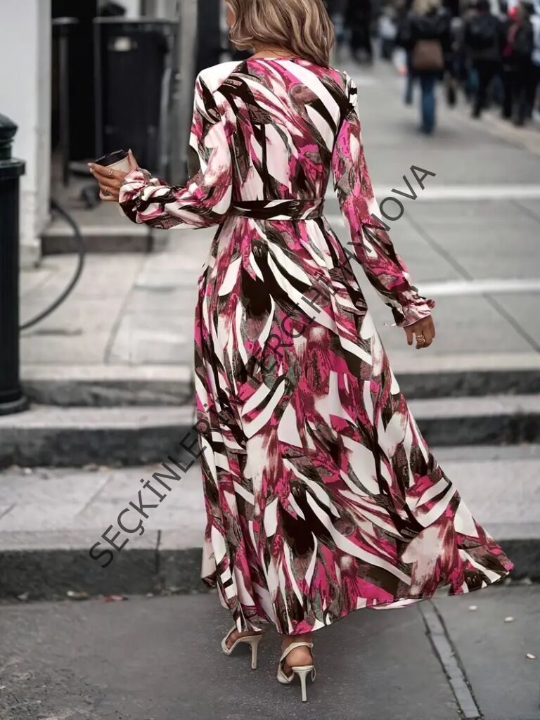 Kadın Uzun Kollu Kruvaze Yaka Belden Kuşaklı Desenli Süprem Elbise