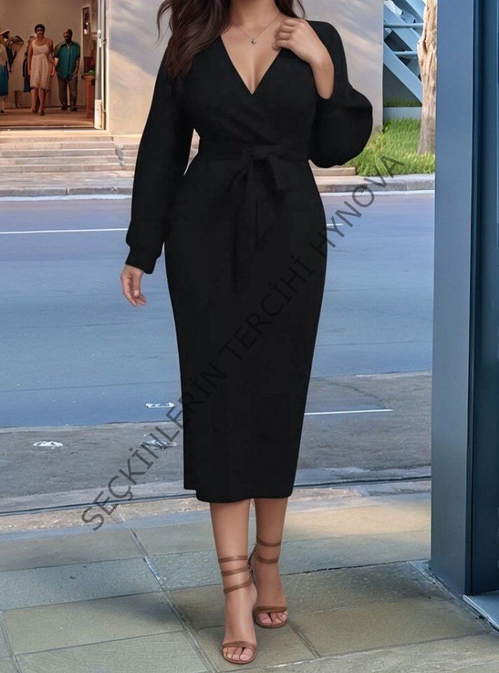 Kadın Uzun Kollu Kruvaze Yaka Belden Kuşaklı Midi Ithal Krep Elbise
