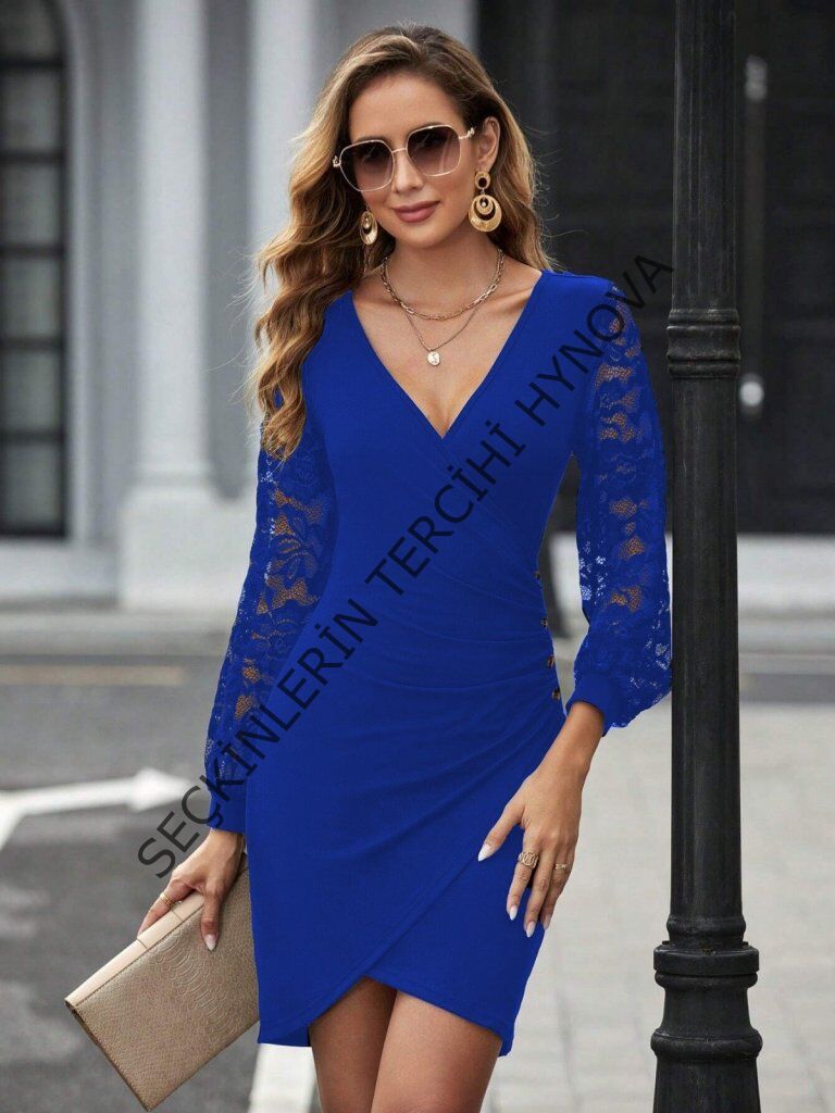 Kadın Uzun Kollu Kruvaze Yaka Beli Düğme Detay Krep Elbise