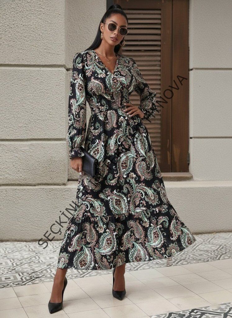 Kadın Uzun Kollu Kruvaze Yaka Beli Lastikli Uzun Desenli Maxi Elbise